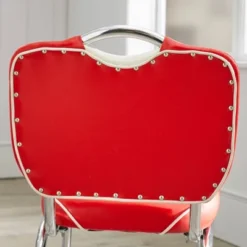 Go retro with the 5 piece Raleigh Retro Dining Set from Buylateral. This set of four chairs and one table will take your space back in time. Simplicity meets style with this white round table and chrome metal pedestal base, accented with a chrome metal band. Paired with padded two-tone chairs upholstered with faux leather and in black and white. These chairs are featured with a shiny chrome frame and legs, while its chair back is highlighted with chrome nailheads accented with an open back handle.